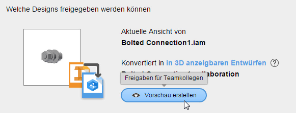 - Klicken Sie auf Generate Preview, um die Datei als 3D-Ansichtsfreigabe zu öffnen und genau das zu sehen, was Sie freigeben (optional). Eine 3D-Ansichtsdatei ist eine schreibgeschützte Kopie der Ansicht des 3D-Modells, das geöffnet war, als Sie die Konstruktionsfreigabe erstellt haben.