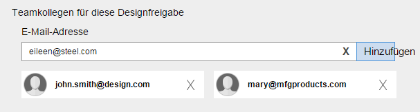 - Geben Sie im E-Mail-Feld die E-Mail-Adresse eines Teamkollegen ein, für den Sie die Konstruktion freigeben möchten, und klicken Sie auf Hinzufügen. Wiederholen Sie diesen Vorgang für jede E-Mail-Adresse.