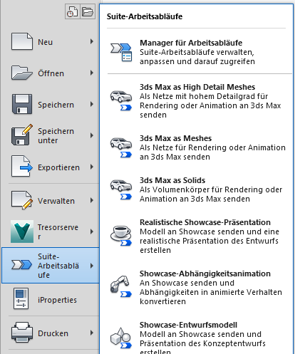 Je nach Suite ist das Quellprodukt entweder AutoCAD, Inventor oder Revit. Das Zielprodukt ist immer 3ds Max oder Showcase. Die mit einer Suite bereitgestellten Arbeitsabläufe richten sich nach der Version der Suite (Standard, Premium oder Ultimate). Unternehmensbenutzer mit eFlex- oder Term Multi-Flex-Lizenzen können alle Arbeitsabläufe verwenden.