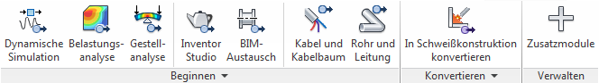 Anmerkung: Dynamische Simulation und Belastungsanalyse sind in Autodesk Simulation-Produkten und in Autodesk Inventor Professional verfügbar. Kabel und Kabelbaum sowie Rohr und Leitung sind nur in Autodesk Inventor Professional verfügbar.