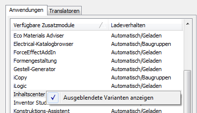 Doppelklicken Sie im Dialogfeld Zusatzmodul-Manager auf den Namen Vernetzte Konstruktion in A360 in der Liste, um zwischen Geladen/Nicht geladen und Start/Geladen und Start/Nicht geladen zu wechseln.