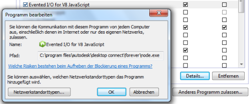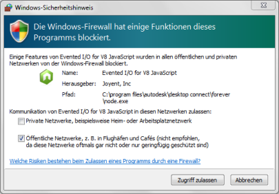 Firewall-Problem: Die Datei Node.exe (Evented I/O für V8 JavaScript) wurde durch die Firewall blockiert.