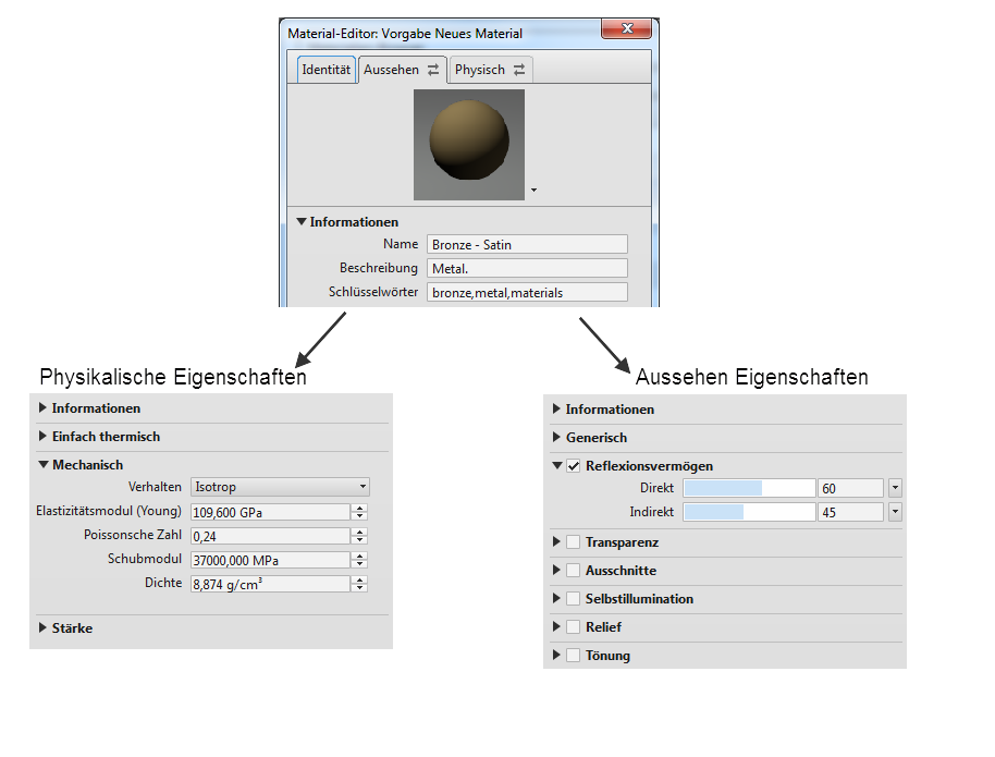 Die Abbildung stellt einige der physikalischen Eigenschaften und Darstellungseigenschaften für das Material Bronze, weiche Zinnbronze dar, wie im Material-Editor angezeigt. Die physikalischen Eigenschaften und die Darstellungseigenschaften werden in verschiedenen Medien des Materials gruppiert. Die Eigenschaftsmedien eines Materials können gesondert bearbeitet werden. Dem Material Bronze können Sie beispielsweise die Farbe Rot zuweisen. Dazu ersetzen Sie das Darstellungsmedium durch ein Medium mit anderen Darstellungseigenschaften, wie Aluminium, rot eloxiert.