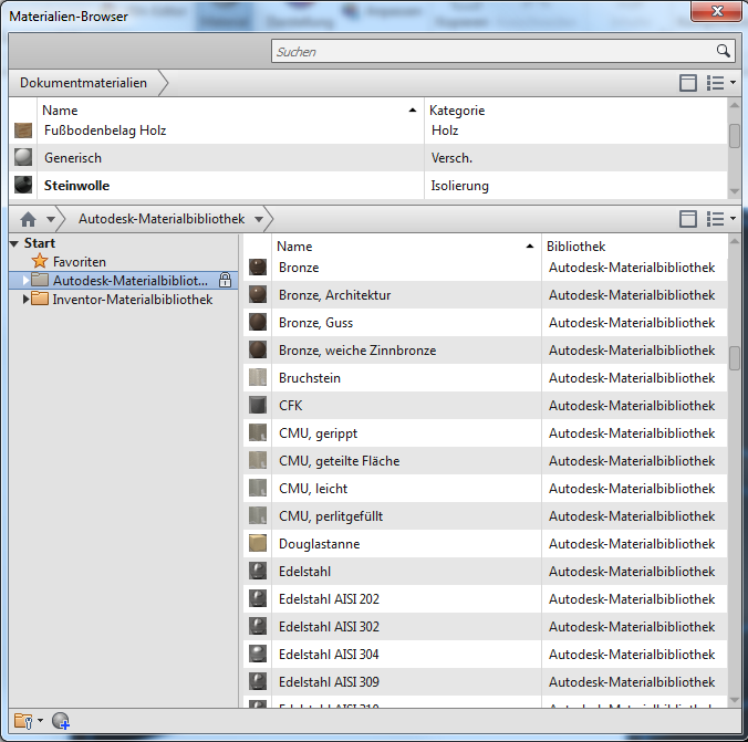 Im Material-Browser werden Materialien gesucht und verwaltet. Häufig werden darin folgende Aufgaben ausgeführt:
