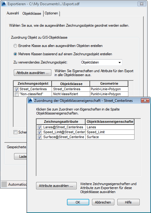 When you export drawing objects, you can use object data to create feature classes in an SDF file. The resulting feature classes have properties that correspond to the object data attributes.