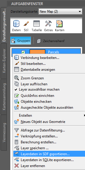 1. Klicken Sie in der Darstellungsverwaltung mit der rechten Maustaste auf den Layer Parcels und anschließend auf Layerdaten in SDF exportieren.
