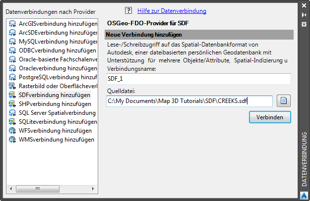 In dieser Übung stellen Sie eine Verbindung zu der neu erstellten SDF-Datei her und sehen die GIS-Objektklassen, die aus den drei Objektklassen erstellt wurden.