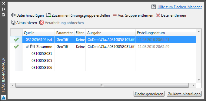 Mit dem Flächen-Manager können Sie ferner unter Verwendung von Zusammenführungsgruppen mehrere Eingabedateien einer einzelnen Flächendatei zuweisen. Sie können beispielsweise eine Zusammenführungsgruppe erstellen, um einen räumlichen Filter auf mehrere Eingabedateien anzuwenden. Quelldateien für eine Zusammenführungsgruppe müssen alle dasselbe Koordinatensystem verwenden.