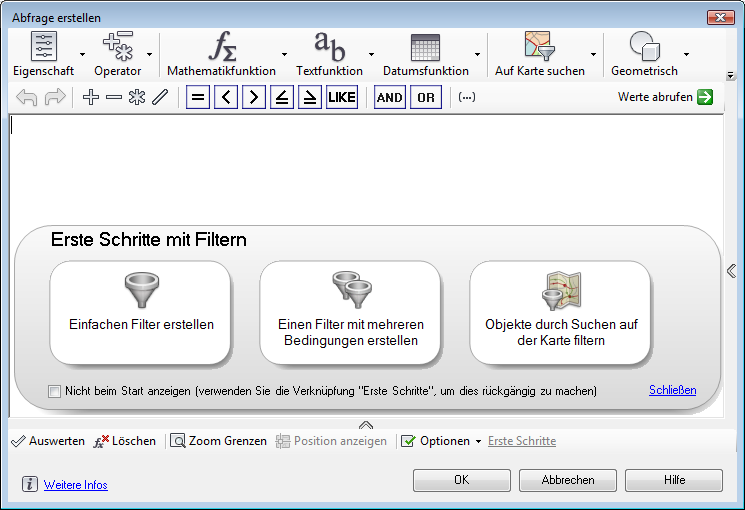 Sie können Daten basierend auf dem Wert einer oder mehrerer Eigenschaften filtern oder wählen. Ein einfacher Ausdruck wertet eine einzelne Eigenschaft aus, aber Sie können auch komplexe Ausdrücke erstellen, die mehrere Eigenschaften bzw. mehrere Werte verwenden. Sie können zum Beispiel einen Ausdruck erstellen, der Bezirke anzeigt, deren Bevölkerungszahl zwischen 50.000 und 100.000 Einwohnern liegt. Das Ergebnis eines Filterausdrucks muss ein boolescher Wert sein. |