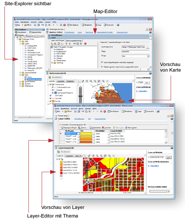 Wenn Sie Infrastructure Studio öffnen und eine Verbindung mit dem Site-Server herstellen (über den WebAgent), werden im Site-Explorer die im Ressourcenspeicher enthaltenen Ressourcen angezeigt, wie im oberen Bild gezeigt. Wenn Sie auf eine der Ressourcen im Site-Explorer doppelklicken, wird der entsprechende Editor für diese Ressource geöffnet. Wenn es sich bei der Ressource um einen Layer oder eine Karte handelt, wird außerdem der Viewer geöffnet und eine Voransicht der Daten angezeigt.