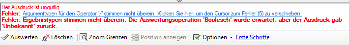 Wenn Sie einen Ausdruck speichern, wird jeweils eine Prüfung durchgeführt, um seine Gültigkeit sicherzustellen. Sie können die Gültigkeit des Ausdrucks auch vor dem Speichern prüfen.