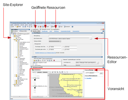 Verwenden Sie im Autodesk Infrastructure Studio-Anwendungsfenster den Site-Explorer, um auf den Ressourcenspeicher und das Editor-Fenster zum Definieren und Bearbeiten von Ressourcen zuzugreifen.