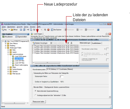 Bei diesem Verfahren wird davon ausgegangen, dass Sie die Bildquelldateien vorbereitet und mit ggf. vorhandenen Georeferenzdateien in einem Ordner abgelegt haben. Am einfachsten können Sie Bilder durch Ziehen in den Site-Explorer laden. Dadurch wird automatisch ein Rasterkatalog für die Bilder erstellt. (Der Rasterkatalog wird erstellt, wenn Sie auf Ressourcen laden klicken.)