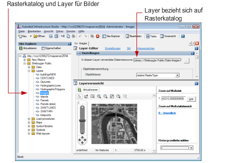 Autodesk Infrastructure Studio konvertiert die Bilder in eine einzige Rasterkatalogressource und erstellt einen Layer als Referenz. Der Rasterkatalog und die Layersymbole werden im Site-Explorer angezeigt.