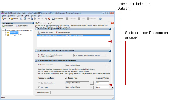 Bei diesem Verfahren wird davon ausgegangen, dass Sie mindestens eine DWF-Datei laden möchten. Um eine DWF-Datei zu laden, ziehen Sie die Quelldatei in den Site-Explorer. In Autodesk Infrastructure Studio werden automatisch ein neuer Layer und eine neue Objektquelle erstellt.
