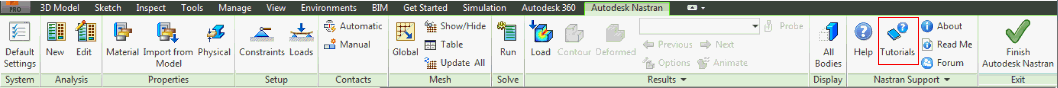 . Die Multifunktionsleiste von Autodesk Nastran wird geöffnet. Klicken Sie jetzt unter NASTRAN-Support auf die Schaltfläche Lernprogramme.