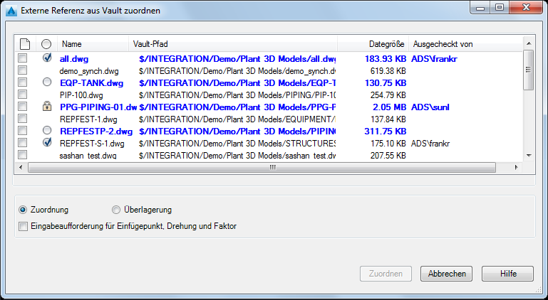 Ein neues Dialogfeld Abrufen/Auschecken unterstützt zusammengehörende Dateien. Wenn Sie jetzt eine DWG-Datei herunterladen (entweder durch Abrufen oder Auschecken), die andere Dateien referenziert, werden die referenzierten Dateien ebenfalls heruntergeladen.