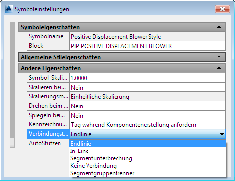 - In-Line. Einstellung für Komponenten, die regelmäßig in Rohrleitungen oder Signalleitungen eingefügt werden. Komponenten mit diesem Verbindungstyp werden zusammen mit der Linie verschoben und verhalten sich als Teil der Linie. Wenn die Linie gelöscht wird, wird auch die Komponente gelöscht.