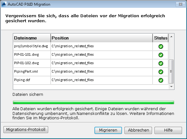 - Klicken Sie auf Weiter. Auf der Seite zur Sicherung vor der Projektmigration wird der Fortschritt des Sicherungsvorgangs angezeigt. Es wird für jede Datei angegeben, ob sie erfolgreich gesichert wurde.