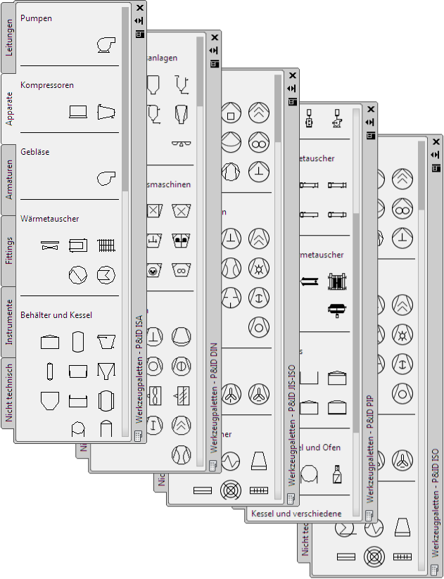 Sie können zu einer anderen Werkzeugpalette wechseln, indem Sie mit der rechten Maustaste auf die Titelleiste der Werkzeugpalette klicken und eine Werkzeugpalette auswählen. Allerdings sind nicht alle in einer bestimmten Norm angezeigten P&ID-Symbole auch in anderen Normen vorhanden.