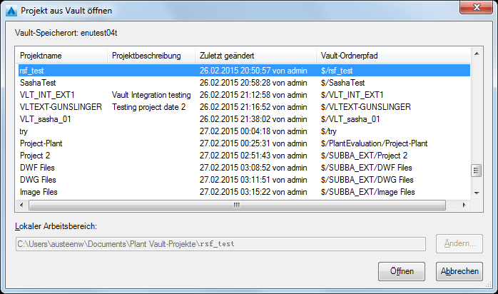 Anmerkung: Um mehrfache Anmeldungen beim Tresor über einen einzelnen Computer zu unterstützen, klicken Sie auf Ändern, und legen Sie den lokalen Arbeitsbereichsordner fest. Sie können zum Beispiel .\Dokumente\Plant Vault Projects_Admin\Projektname für die Administratoranmeldung festlegen und den Vorgabeordner für eine andere Tresoranmeldung verwenden. Die Änderung wird übernommen, wenn Sie ein Projekt erstmalig öffnen (für jede Tresoranmeldung).