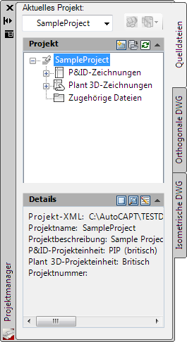 Der Projektmanager enthält drei Registerkarten: Quelldateien, Orthogonale DWG und Isometrische DWG.