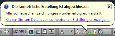 Klicken Sie in der Statusleiste auf das Symbol für isometrische Zeichnungen, um das Dialogfeld Isometrische Erstellungsergebnisse anzuzeigen.