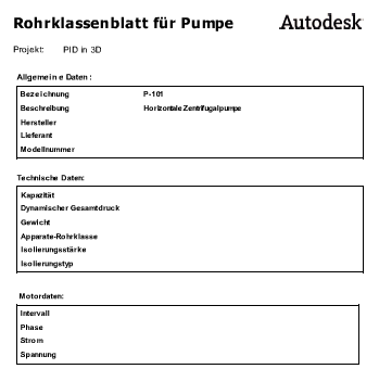 Erzeugt ein P&ID-Rohrklassenblatt. Weitere Informationen finden Sie im unten aufgeführten Beispielbericht.
