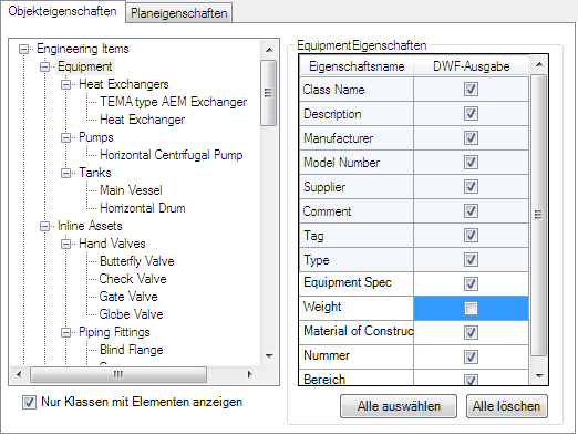 - Klicken Sie in der Strukturansicht auf eine Komponente (z. B. Apparate). Deaktivieren Sie im Bereich Eigenschaften in der Spalte DWF-Ausgabe die Kontrollkästchen für alle Eigenschaften, die nicht publiziert werden sollen (z. B. Gewicht).