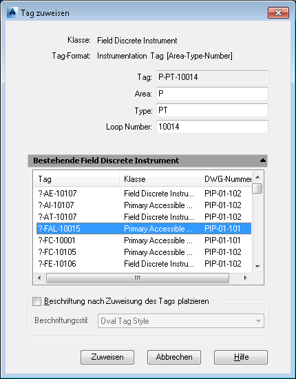 Wenn der Administrator die Tag-Formatierung konfiguriert hat, wird beim Hinzufügen einer Komponente oder Linie, die ein Tag erfordert, das Dialogfeld Tag zuweisen geöffnet.