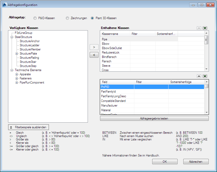 - Klicken Sie für den Abfragetyp auf P&ID-Klassen, Zeichnungen oder Plant 3D-Klassen.