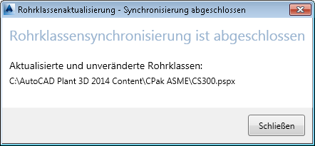 Zum Synchronisieren von Rohrklassen mit Katalogen muss die Rohrklassendatei geschlossen werden. Zudem ist ein exklusiver Zugriff auf die Rohrklassendatei erforderlich.