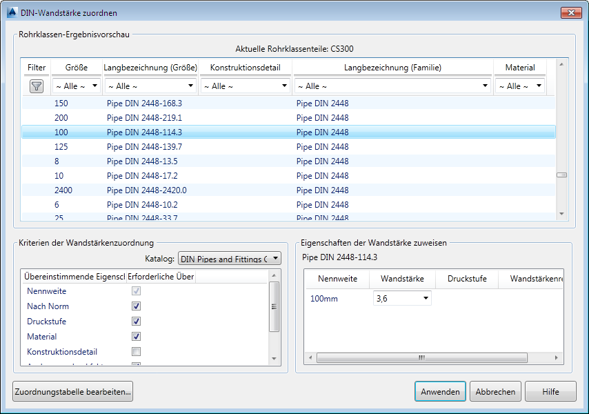 Zeigt das Dialogfeld Zuordnungstabelle für die DIN-Wandstärke bearbeiten an. Die Wandstärkenzuordnung wird mit dem Katalog gespeichert.