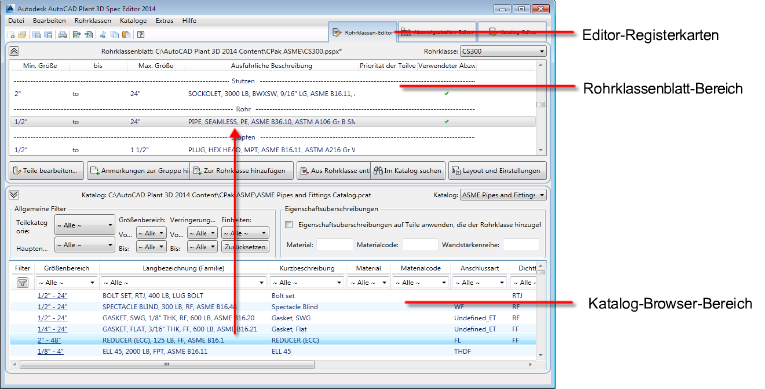 Auf der Registerkarte Rohrklassen-Editor fügen Sie Komponenten aus dem Fenster Katalog-Browser zum Fenster Rohrklassenblatt hinzu.