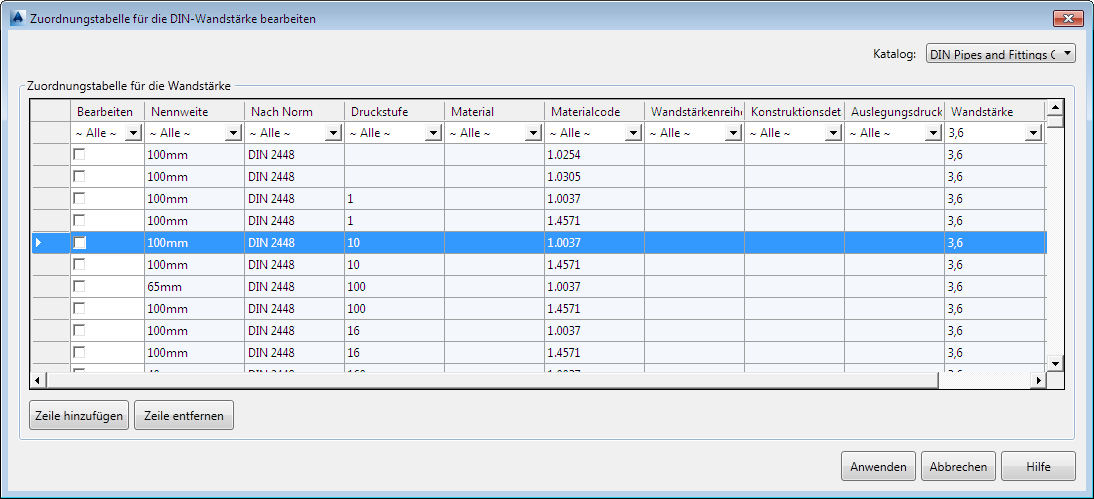 Ermöglicht das Bearbeiten der Optionen der Zuordnungstabelle für die DIN-Wandstärke.