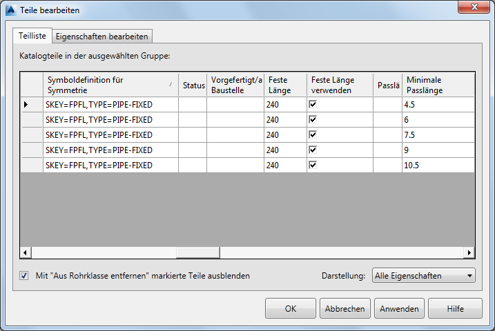 Verwenden Sie den Rohrklassen-Editor, um die Eigenschaften Feste Länge verwenden und Feste Länge in der Rohrklasse des Projekts festzulegen. Die Eigenschaften für die feste Länge müssen festgelegt werden, um die neuen Routing-Funktionen für Rohre mit fester Länge zu aktivieren.