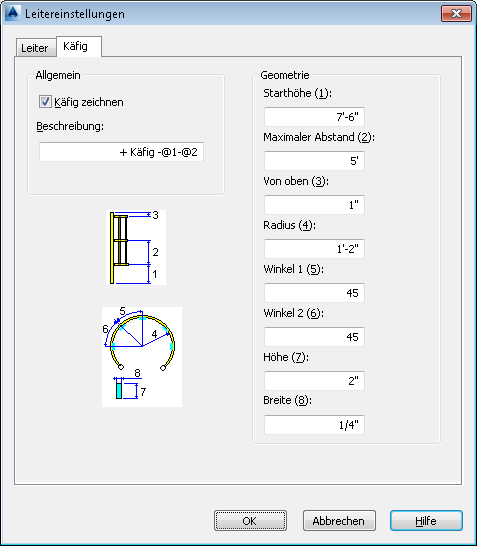Legt die Geometrieeinstellungen für den Käfig fest. In Klammern angegebene numerische Werte entsprechen der beschrifteten Geometrie im Vorschaubild.