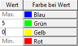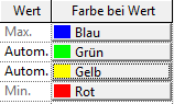 Standardmäßig sind Farb-Wert-Paare für Maximal- und Minimalwerte vorgegeben. Diese Werte sind relativ zu den angezeigten Daten. Sie können nur die Farben für die Minimal- und Maximalwerte (Min./Max.) festlegen. Diese Farb-Wert-Paare können nicht gelöscht werden.