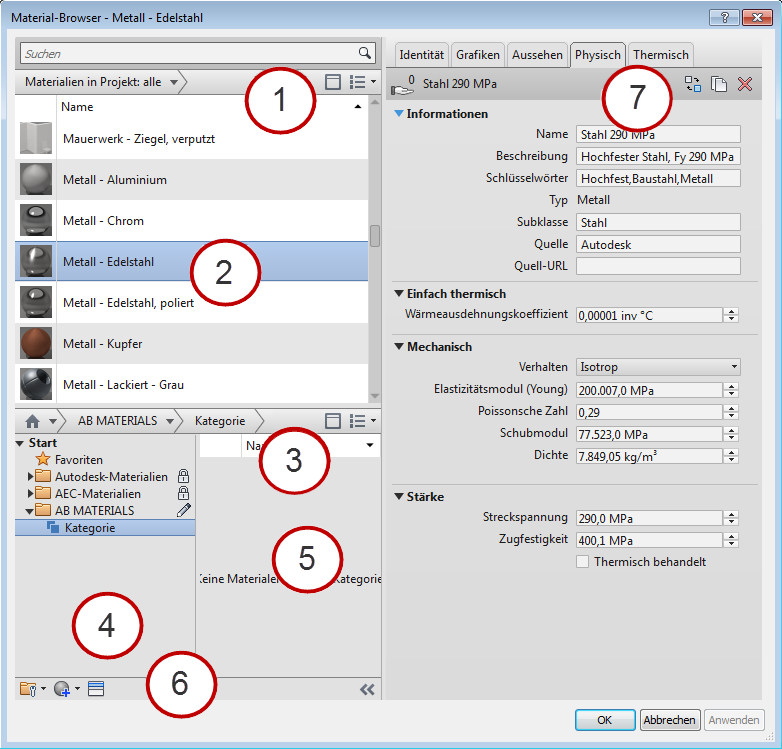 | 7 | Wenn Sie ein Material in der Bibliotheksliste (linker Fensterbereich) auswählen, werden im rechten Bereich die Registerkarten (Objekte) für dieses Material angezeigt. Durch Klicken auf die Registerkarten (z. B. ID oder Darstellung) zeigen Sie die Eigenschaften und Objekte des Materials an. Bei der Anzeige von Materialien in Bibliotheken sind die Eigenschaften schreibgeschützt. |