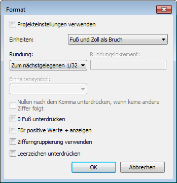Die Option Projekteinstellungen verwenden ist standardmäßig ausgewählt. Das bedeutet, dass der Wert entsprechend der Einstellung Einheiten im Projekt angezeigt wird. Weitere Informationen erhalten Sie unter Einheiten.