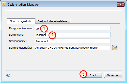 3. Weisen Sie im Designstudien-Manager der Designstudie, dem Design und dem Szenario einen Namen zu.