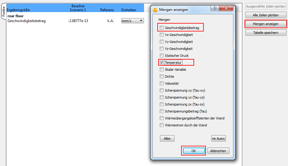 Klicken Sie auf die Zeile Temperatur und klicken Sie auf Ausgewählte Zeilen plotten:
