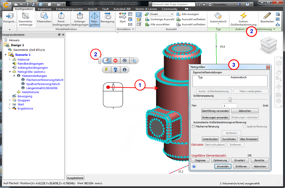 Verwenden Sie die Netzwerkzeuge zum Anpassen der Netzverteilung. Alle Werkzeuge sind über das Schnellbearbeitungs-Dialogfeld Netzgrößen verfügbar. Um den Arbeitsablauf zu vereinfachen sind viele auch im kontextabhängigen Werkzeugkasten und in der kontextabhängigen Gruppe verfügbar.