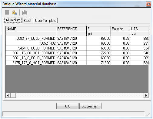 Wenn Einheiten von Ihrem FE-Modell abgeleitet werden können, wählt der Ermüdungsberechnungsassistent sie automatisch aus. Alternativ können die Materialdatenwerte automatisch in vier häufig verwendete Einheitensysteme konvertiert werden, indem Sie die entsprechende Option auswählen.