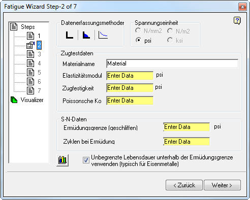 Wenn Sie in Schritt 1 die Durchführung einer Ermüdungssicherheitsfaktor-Berechnung ausgewählt haben, erfordert die Materialdateneingabe für die Berechnung des Ermüdungssicherheitsfaktors die gleichen Daten wie die SN-Lebensdauerberechnungsmethode (Elastizitätsmodul, Zugstärke, Poissonsche Konstante, Ermüdungsgrenze und Anzahl der Zyklen bis zum Ausfall) und zusätzlich die Anforderungen zur Beschreibung der Kurve für unbegrenzte Lebensdauer.