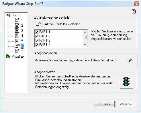 Wählen Sie in Schritt 6 die Bauteile des Modells aus, die für die Ermüdungsberechnung verwendet werden sollen. Legen Sie weiterhin einige erweiterte Optionen für die Berechnung fest.