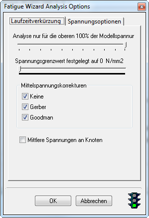Standardmäßig berechnet der Assistent für die Ermüdungsberechnung Ergebnisse mit drei Methoden, bei denen mittlere Spannungen berücksichtigt werden. Wenn eine Berechnung mit diesen Methoden nicht erforderlich ist, deaktivieren Sie sie in den Analyseoptionen, um die Laufzeit zu verkürzen.