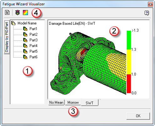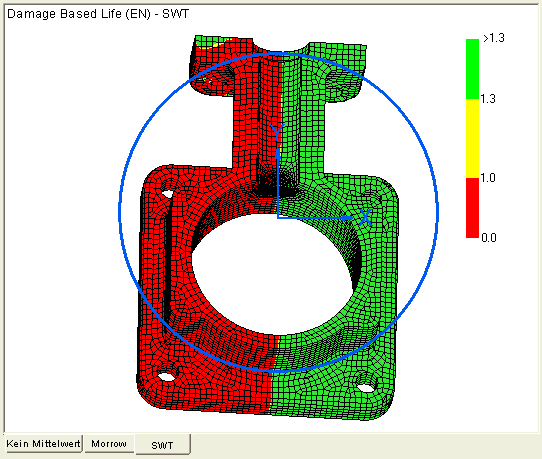Der Assistent für die Ermüdungsberechnung zeigt zwei Typen von Ergebnissen mit Kontur an: Ampellicht-Plot (drei Farben) und Standard-Plot mit zehn Konturbändern. Um zwischen den Plottypen zu wechseln, klicken Sie auf das entsprechende Symbol in der Hauptwerkzeugleiste.
