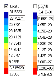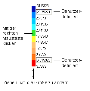 In der Anzeige eines Ergebnissatzes mit Kontur wird ein Konturband auf der rechten Seite des Fensters angezeigt. Die Konturbänder variieren zwischen den minimalen und maximalen Datenwerten des Ergebnissatzes. Sie können Anpassungen vornehmen, wie hier gezeigt.