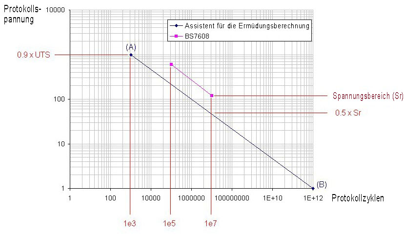 BS7608 definiert eine Belastungsbereichskurve, in der Regel auf Grundlage von Punkten bei 1e5 und 1e7.